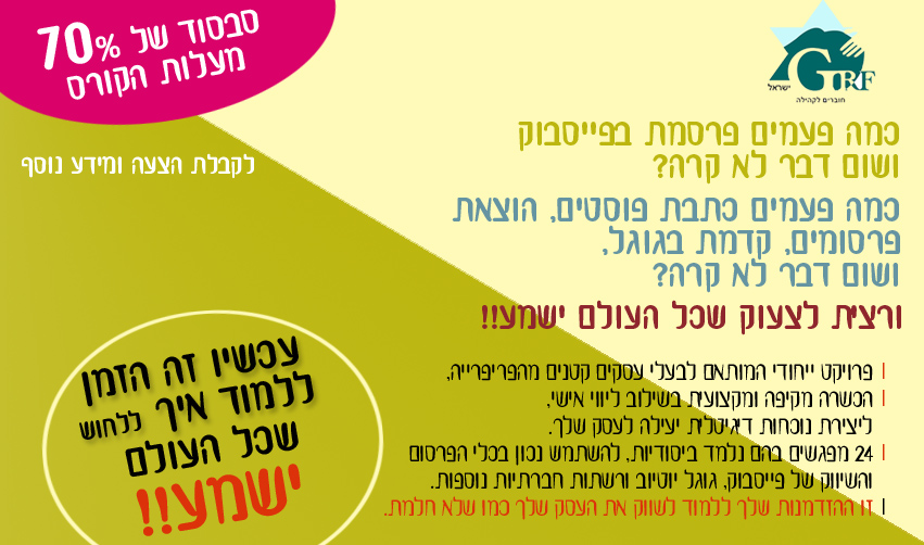 תושבי הפריפרייה זוהי ההזדמנות שלכם. קורס מנהלי שיווק באינטרנט,זכאות למלגת מימון של 70% משכר הלימוד,שייוק באינטרנט,רכישת מקצוע,קורס שיווק באינטרנט,קורס קידום אתרים באינטרנט,לימודי שיווק באינטרנט,שיווק אינטרנטי,שיווק ופרסום באינטרנט,פרסום ושיווק באינטרנט,קורס פרסום באינטרנט,קורס קידום אתרים, כיצד לקדם את העסק שלך באינטרנט,קורס שיווק ופרסום באינטרנט, מנהלי מדיה חברתית,כתיבה שיווקית,מנהל מדיה חברתית,קורס שיווק דיגיטאלי,קורס שיווק דגיטלי,במיזם החברתי, המיזם החברתי לפתוח קריירה ויזמות עסקית,GRF ישראל,קורס מנהל שיווק באינטרנט, קורס לקידום עסקים באינטרנט,קידום עסקים באינטרנט,סבסוד 70%,לבעלי עסקים קטנים,פריפרייה,הכשרה מקיפה,הכשרה מקצועית,לימודים,קורס,קורסים,שיווק בפייסבוק,שיווק בגוגל,GRF,